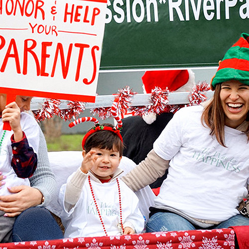 Die 21 Regeln fürs Glücklichsein werden bei der 34. Weihnachtsfeier beworben.